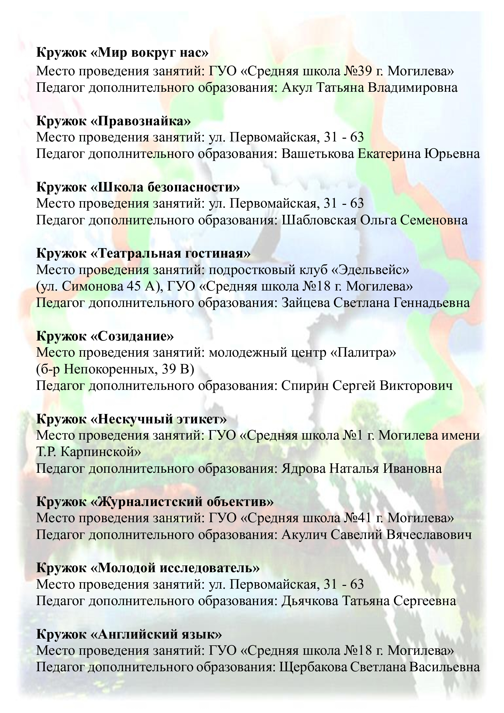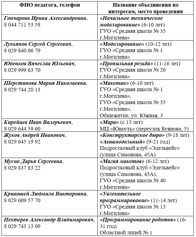 Здесь работают кружки технического, спортивно-технического, физкультурно-спортивного и естественно-математического профилей. Учащиеся конструируют, моделируют, тренируются, исследуют и развиваются в атмосфере творчества и движения.
