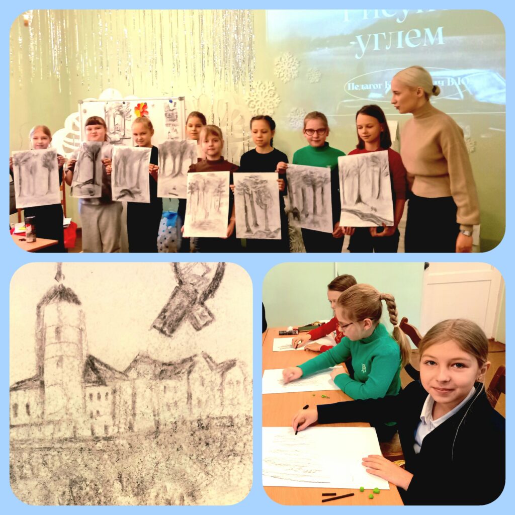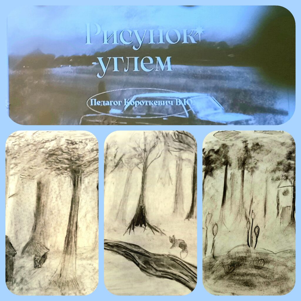 Состоялось открытое занятие в кружке «Колорит» (педагог Короткевич В. Ю.) отдела декоративно-прикладного и изобразительного творчества Государственного учреждения дополнительного образования «Многопрофильный центр по работе с детьми и молодежью «Юность» г. Могилева» по теме «Рисунок углем «Сосновый бор». В рамках данного занятия педагог познакомил учащихся с нетрадиционной техникой рисования – рисование углем.
